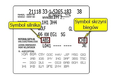 Na nalepce znajduje się wiele zakodowanych informacji. Przy zakupie skrzyni istotny jest jej symbol (kod). Poniżej przykłady trzech nalepek identyfikacyjnych ze wskazanymi miejscami z symbolem (kodem) skrzyni biegów.