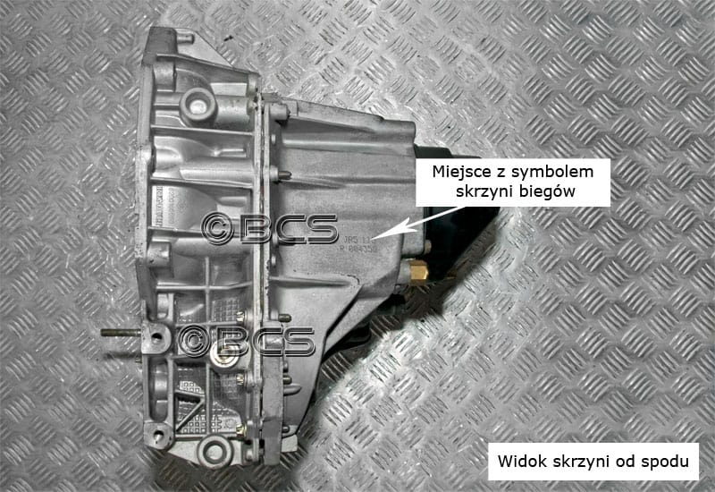 Symbol skrzyni biegów na skrzyniach biegów JR5 naniesiony jest w podobnym miejscu, tzn. pod skrzynią biegów w miejscach wskazanych na zdjęciach. Po dokładnym oczyszczeniu symbol można odczytać spod auta (potrzebny jest podnośnik lub kanał). Przy odczycie przyda się szmatka z benzyną ekstrakcyjną do przeczyszczenia oraz latarka, którą często przy odczycie trzeba świecić na symbol pod różnym kątem. Symbol skrzyni biegów Renault JR5 jest naniesiony na obudowę w formie wydruku typu matrix - wypalony w postaci kropek.